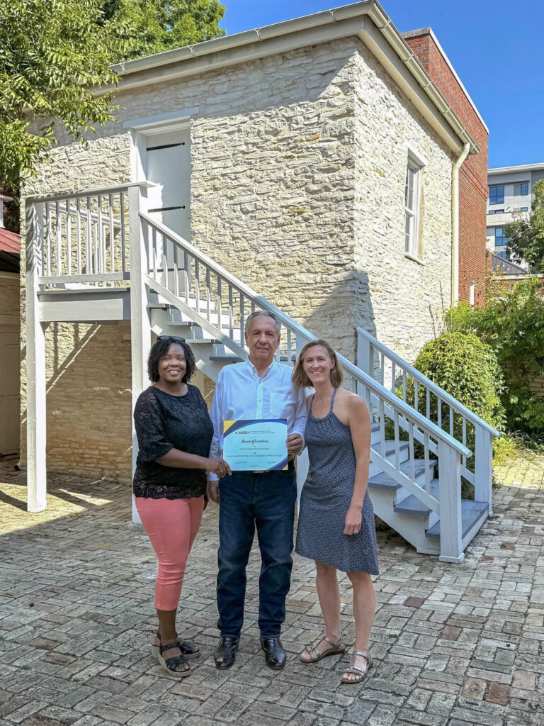 Earlier this month, the American Association for State and Local History (AASLH) presented the Neill-Cochran House Museum with a Leadership in History Award for the completion of Reckoning with the Past, the project to restore and reinterpret Austin’s last intact slave dwelling. There are so many people to share in the acclaim for this groundbreaking, years-long effort. These include the three pictured here: project researcher Dr. Tara Dudley (UT), interpretive planner Ted Lee Eubanks, and NCHM Executive Director Dr. Rowena Dasch.